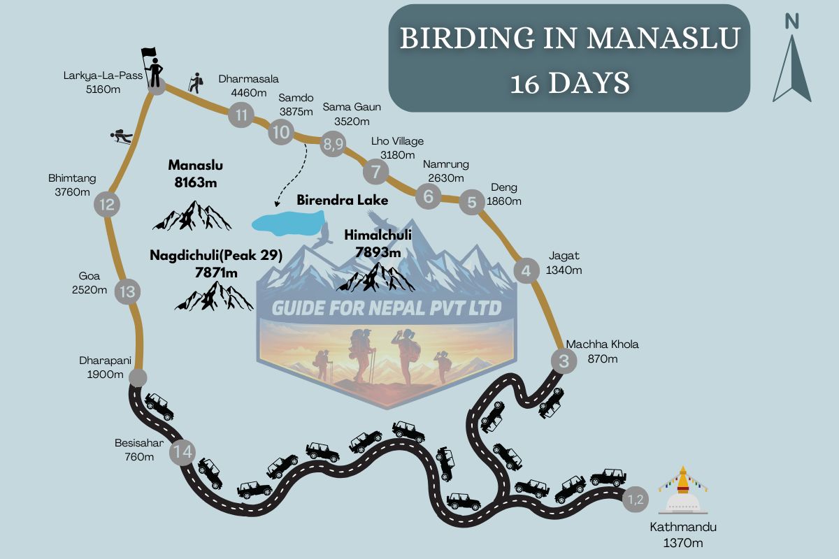 Below is our day to day Itinerary of the Manaslu Birding Trek - 16 Days.