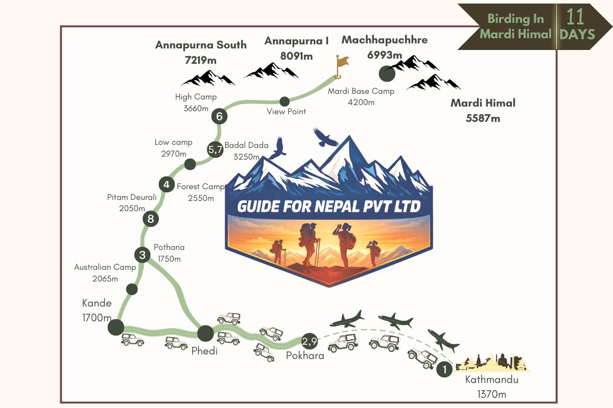 Below is our day to day Itinerary of the Mardi Himal Birding Trek - 11 Days.